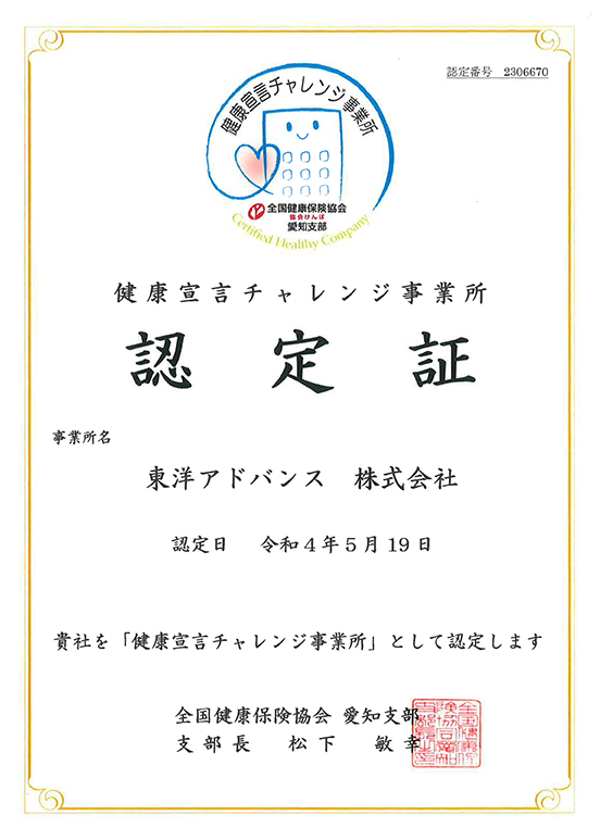 News 2026.03.18 健康宣言チャレンジ事業所に認定されました 東洋アドバンス株式会社は、全国健康保険協会より、健康宣言チャレンジ事業所に認定されました。 << Old 実績はコチラ お問合せはコチラ 当社の特徴はコチラ
